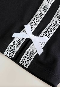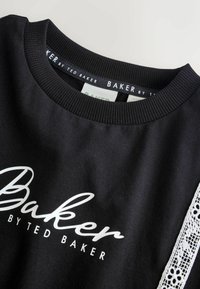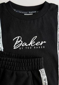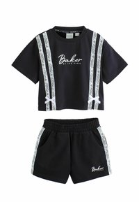 Set format din top crop cu mâneci scurte negre și pantaloni scurți, cu dungi albe din dantelă și textul „Baker by Ted Baker” pe partea frontală a ambelor piese.