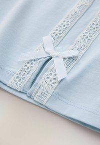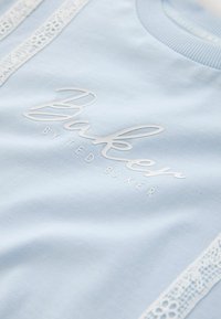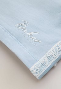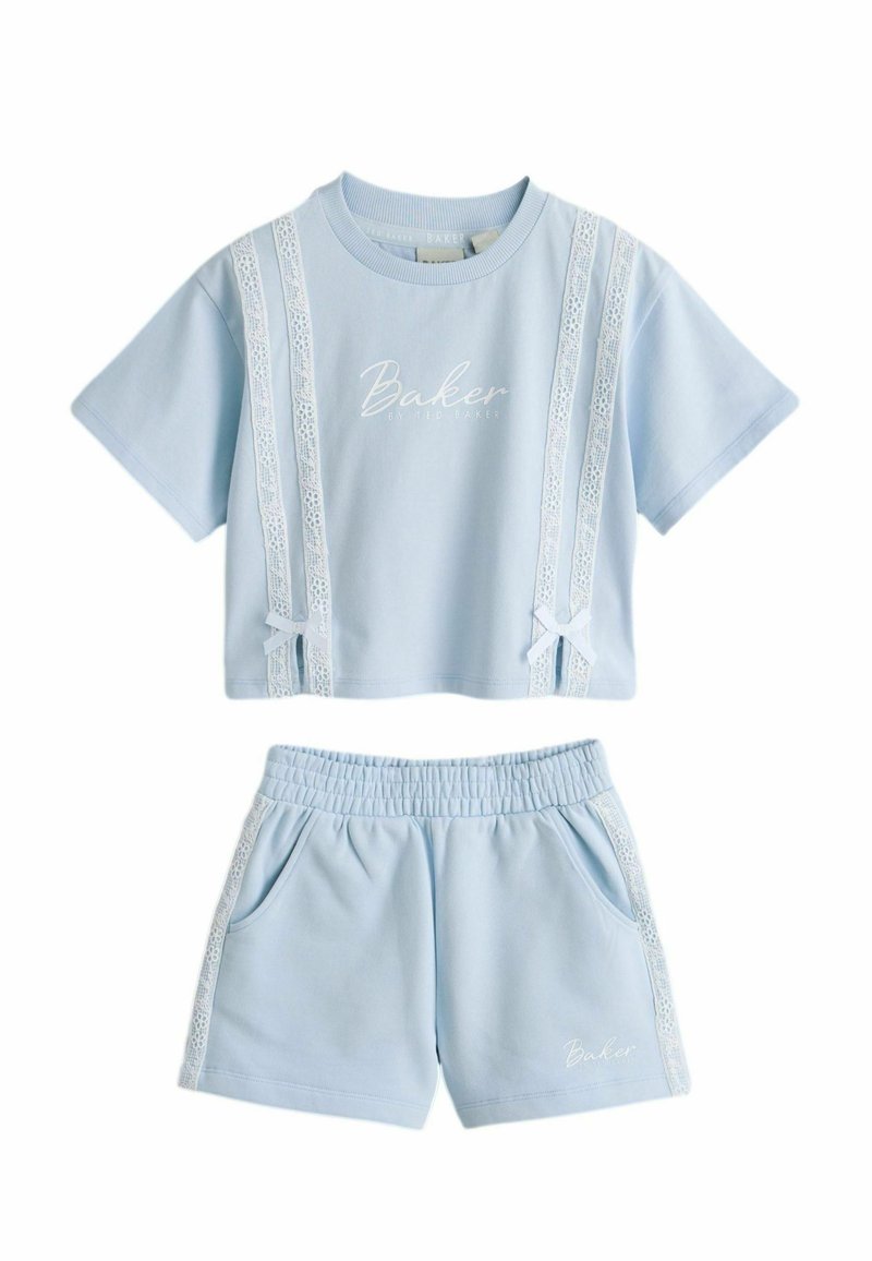 Set două piese bleu deschis, format dintr-un crop top cu mâneci scurte și pantaloni scurți cu talie elastică, având dungi din dantelă albă și textul logo „Baker”.