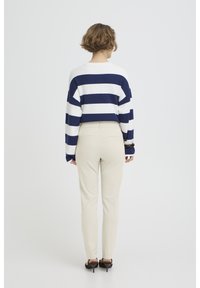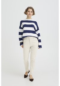 Tânără care stă în picioare, purtând un pulover cu dungi albastre și albe, pantaloni bej și pantofi cu toc ascuțit de culoare închisă, pe un fundal simplu.