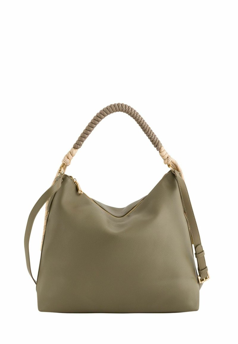 Geantă de mână din piele verde măsliniu, cu mâner împletit bej și maro, fermoar auriu și curea de umăr reglabilă.