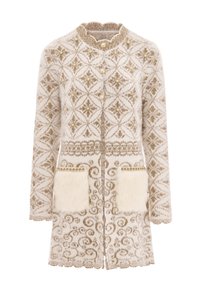 Cardigan bej pufos, cu modele intricate în formă de diamant, accente din perlă și două buzunare căptușite cu blană. Prezintă un închidere cu nasturi și un gât rotund.