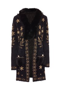 Cardigan bej pufos, cu un guler ondulat și accente de blană. Prezintă cusături decorative și două buzunare frontale cu embellismente.
