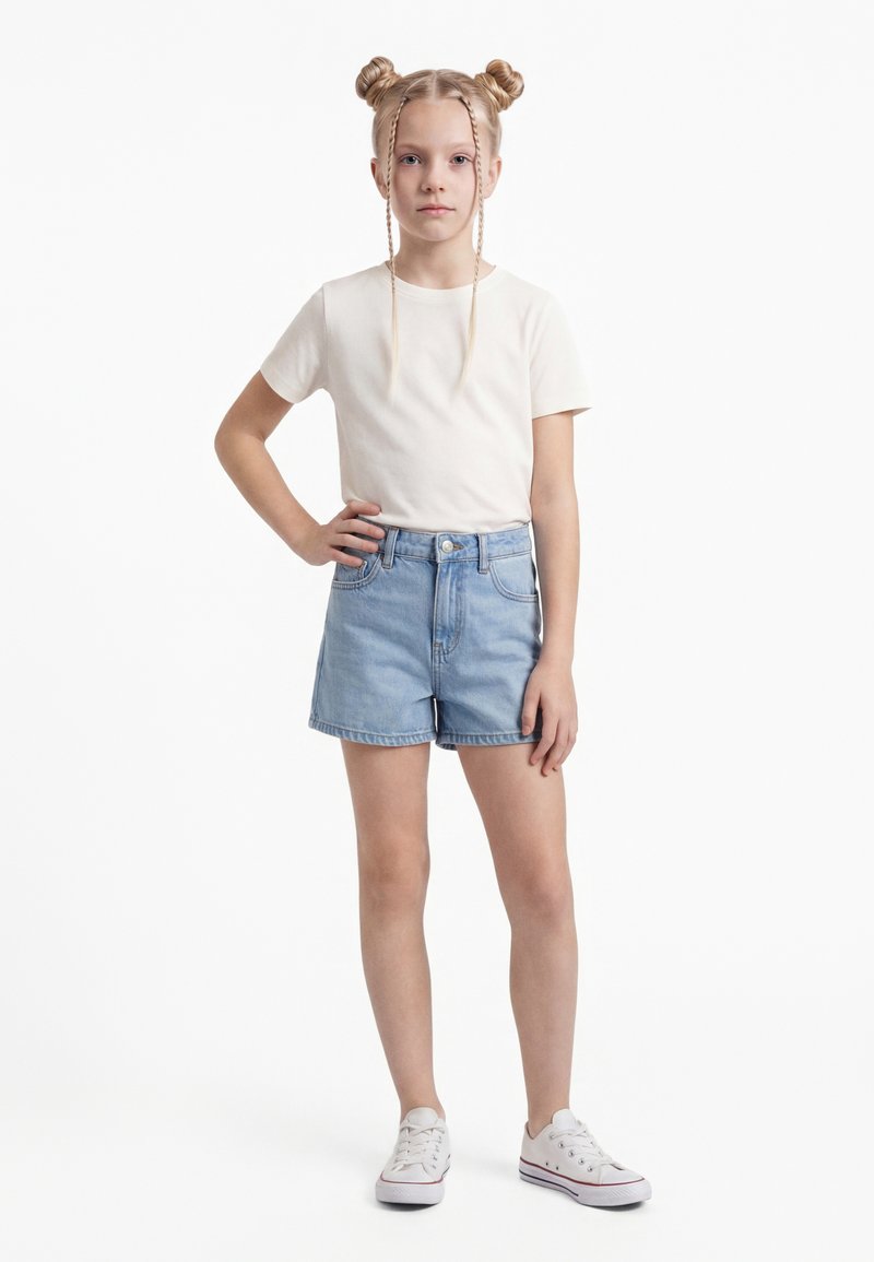 Fată blondă cu cocuri duble și șuvițe împletite poartă tricou alb, pantaloni scurți de blugi albaștri și adidași albi, stând cu o mână pe șold.