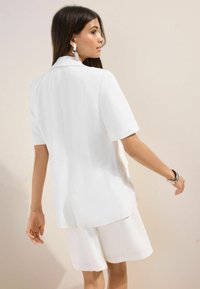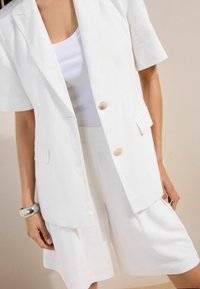 Tânără cu păr lung și castaniu poartă un sacou alb cu mâneci scurte și pantaloni scurți asortați, până la genunchi, pe un fundal simplu și deschis la culoare.