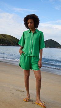 Femeie cu păr lung și creț, purtând un tricou verde aprins cu mâneci scurte și pantaloni scurți asortați cu margine albă în formă de valuri, stând în picioare pe un fundal simplu.