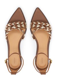 Picioare purtând sandale plate maro cu vârf ascuțit, cu bretele împletite și accente aurii, prevăzute cu închideri cu cataramă la gleznă, pe un podea neutră.