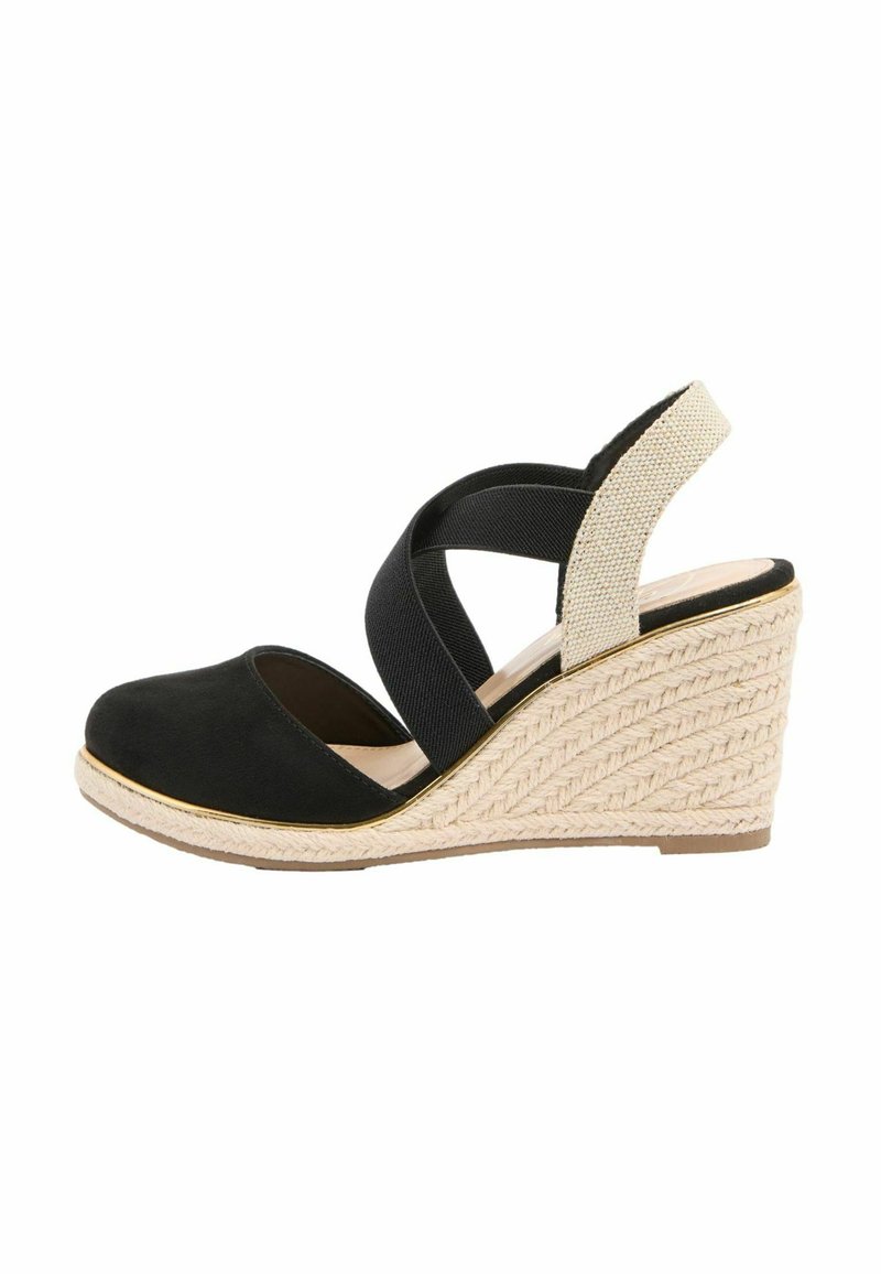 Sandale negre cu toc wedge închis la vârf, toc bej împletit, cu bretele elastice în cruce și o curea bej pentru gleznă.