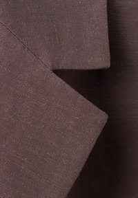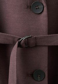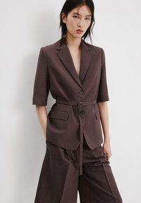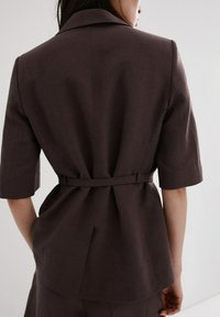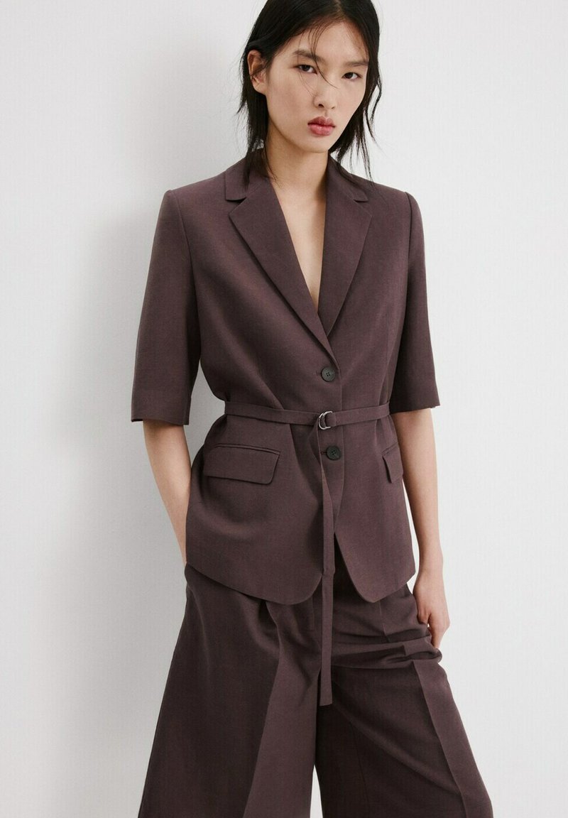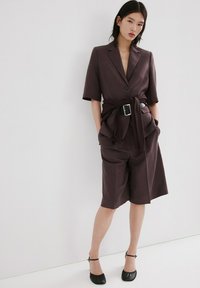 Tânără cu păr negru drept poartă un sacou maro închis cu curea și mâneci până la cot, asortat cu pantaloni largi de aceeași culoare.