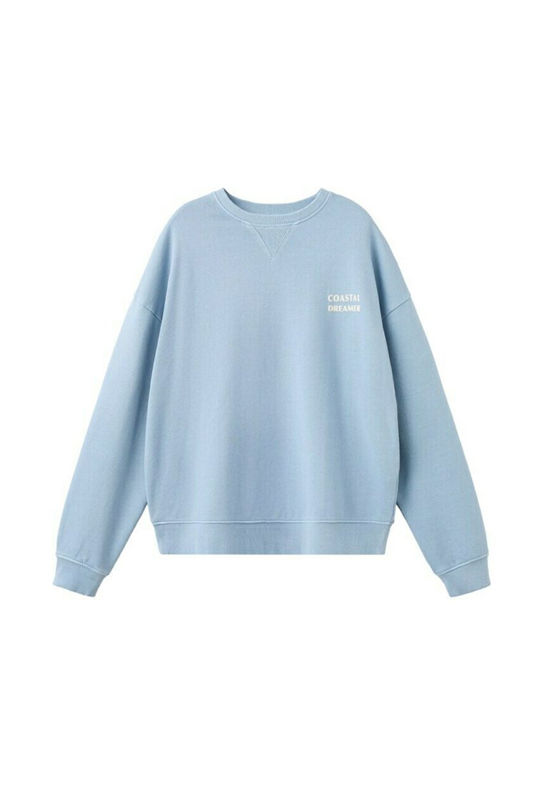 Bluza cu mâneci lungi de culoare albastru deschis, cu manșete și tiv striate, având text alb "COASTAL DREAMER" pe partea stângă a pieptului.