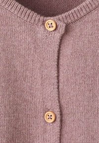 Salopetă tricotată în roz pal, cu mâneci lungi, decolteu rotund și nasturi de lemn pe față. Manșete striate și croială lejeră.
