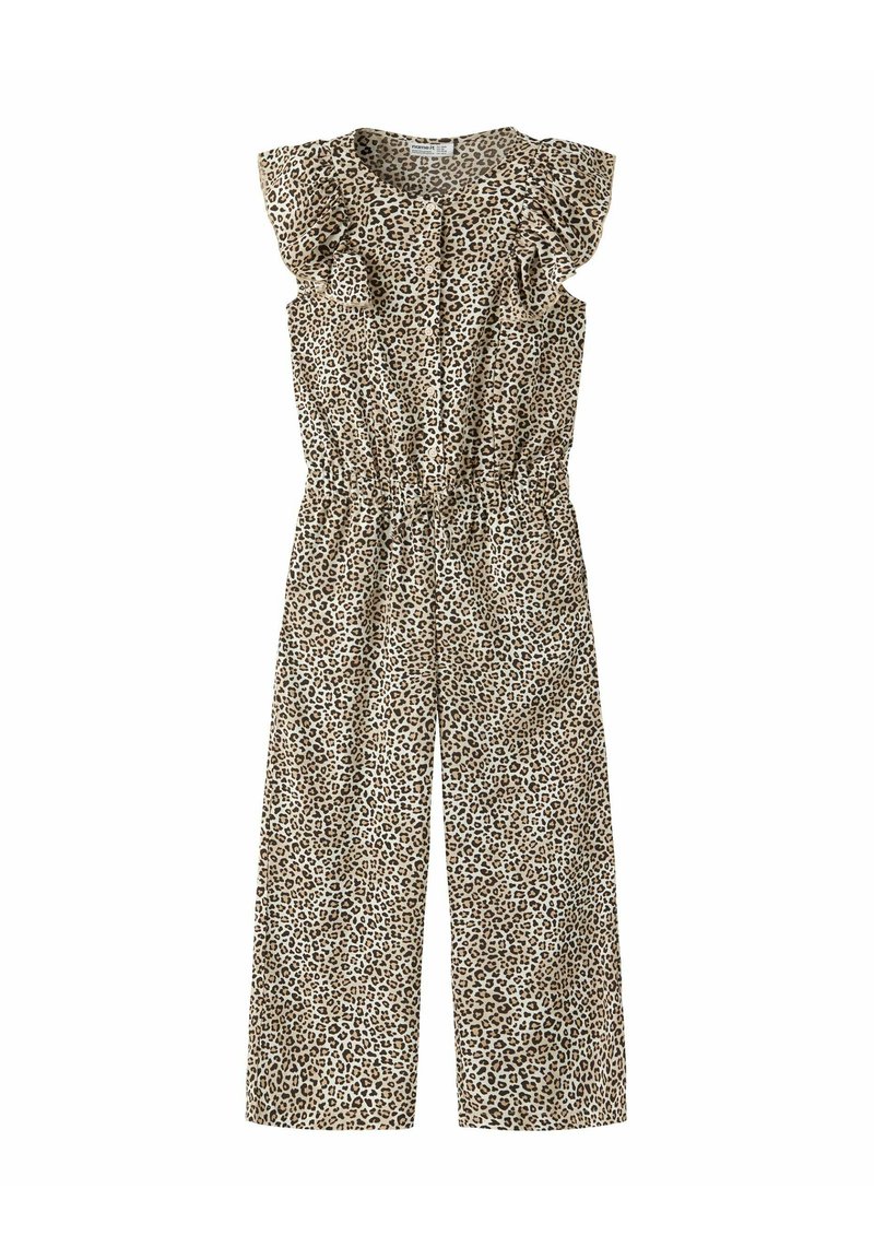 Salopetă fără mâneci cu imprimeu leopard bej și maro, cu nasturi în față, umeri cu volane și talie elastică, pantaloni cu picioare largi.