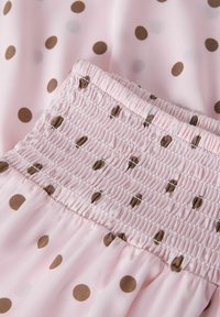 Fustă stratificată roz deschis cu buline maro și talie largă elastică, lungime până la genunchi, material fluid.