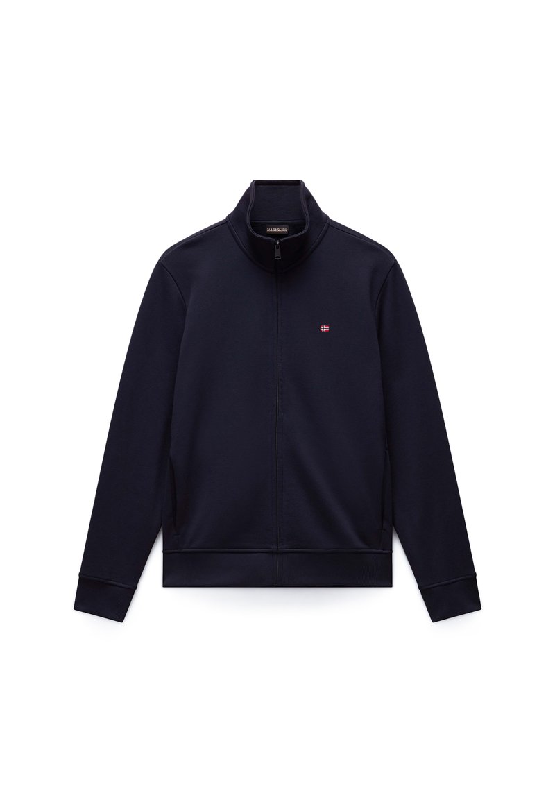 Jachetă bleumarin cu fermoar, guler înalt și mic logo cu steag brodat pe pieptul stâng, mâneci lungi și manșete și tiv cu rebruiri.