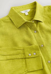 Cămașă cu mâneci lungi din in verde lămâie, cu guler, închidere cu nasturi la față și tiv curbat, pe un fundal alb.