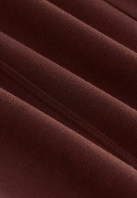 Pantaloni maro, largi, din material moale. Au talie elastică cu șnur, două buzunare laterale și cusături subtile.