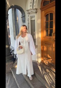 • Rochie albă, lungă, cu nasturi, cu mâneci scurte tip balon și guler. O geantă albă texturată și pantofi albaștri împletiți completează aspectul.