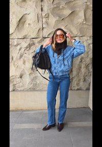 • Jachetă din denim cu model matlasat, fular tricotat maro, geantă neagră cu accente roz și roșu, blugi albaștri și cizme maro cu vârf ascu�țit.