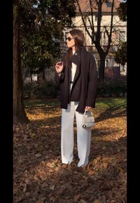 • Palton negru supradimensionat, top alb mulat, pantaloni albi evazați și geantă mică albă. Stând pe frunze căzute, cu un copac în fundal.