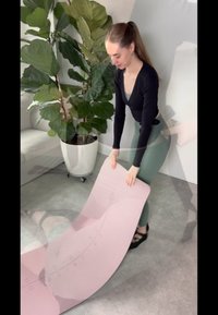• Saltea de yoga de un roz moale, ținută de o persoană îmbrăcată într-un top negru din material ușor și colanți verzi. Decor interior cu o plantă mare și o canapea de culoare gri deschis.