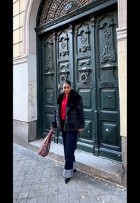 • Palton din blană sintetică neagră, cu un strat interior roșu, geantă mare bordeaux cu ținte argintii, blugi închisi la culoare, stând în fața unei uși verzi. Texturi netede.