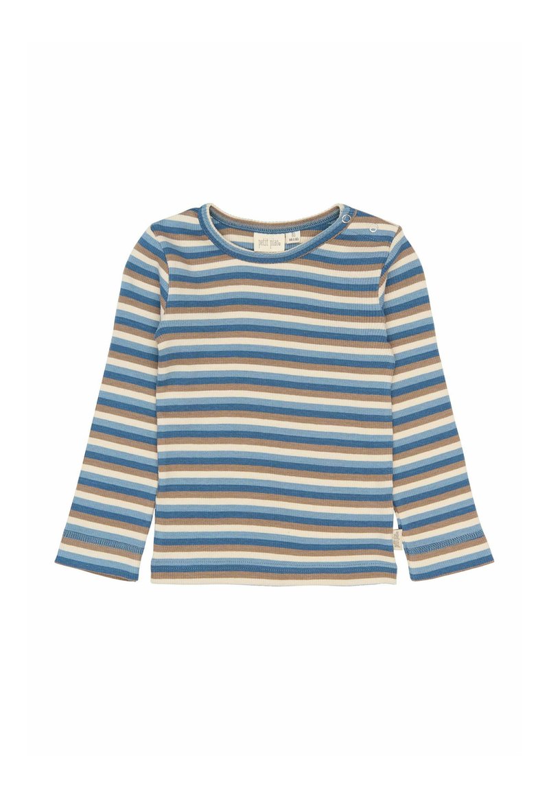 Cămașă pentru bebeluși cu mânecă lungă, cu dungi orizontale în nuanțe de albastru, bej, crem și maro, având două capse pe umăr.