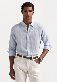 Cămașă button-down cu dungi albastre deschise, din bumbac, cu guler, mâneci răsfrânte și un logo mic, asortată cu pantaloni crem și o curea maro.
