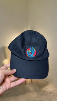 Șapcă neagră de baseball cu un grafic brodat colorat reprezentând o mână albastră și un cerc roșu pe panoul frontal, prezentată pe un fundal alb simplu.