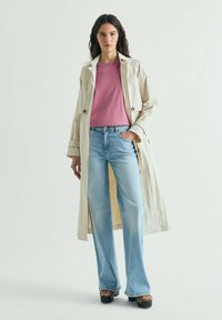 Tânără cu păr lung și întunecat poartă o jachetă bej peste un tricou roz și blugi bleu deschis, stând cu mâinile în buzunare.