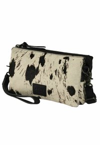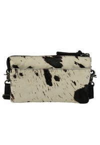 Portofel mic dreptunghiular cu model de piele de vacă alb-negru, fermoar negru, curea detașabilă din piele neagră și patch cu logo cusut negru.