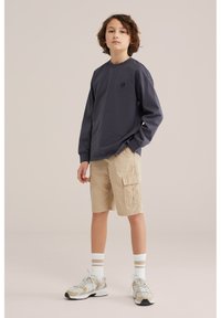 Tânăr îmbrăcat într-un tricou cu mâneci lungi de culoare închisă, pantaloni scurți cargo bej, șosete albe cu dungi și adidași bej, pe un fundal simplu.