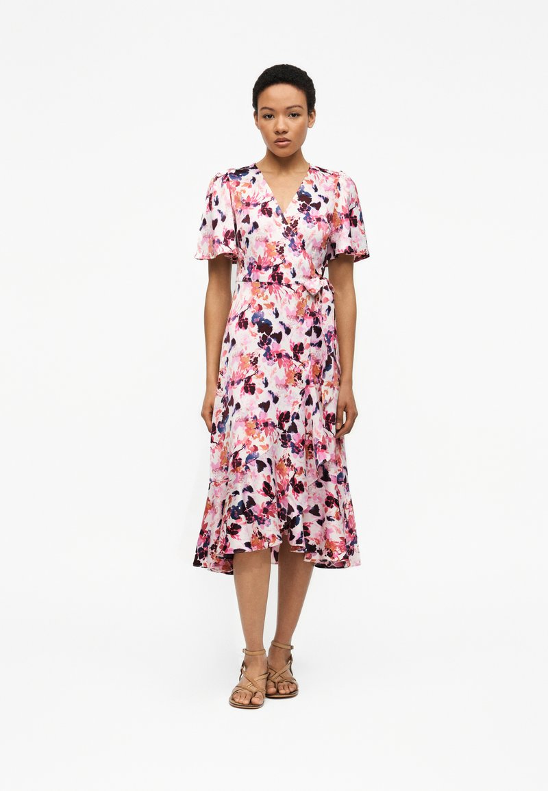 Femeie în picioare, purtând o rochie tip wrap roz cu motive florale, mâneci scurte evazate și sandale bej cu barete, pe un fundal alb simplu.